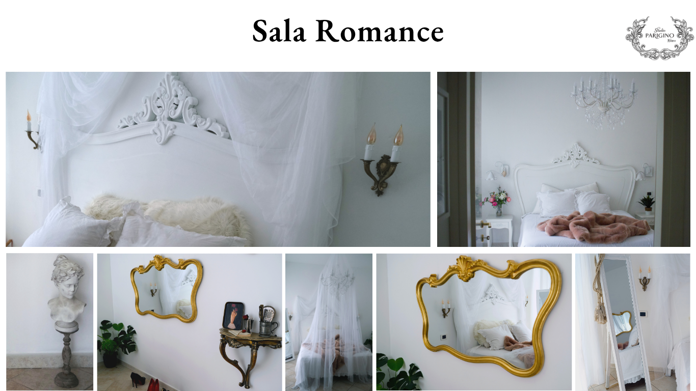 Con il noleggio hai accesso a entrambe le sale: Vittoriana (pareti rosso pompeiano, divani e poltrone d’epoca) e Romance (letto matrimoniale e arredi romantici) – pagando un unico prezzo.